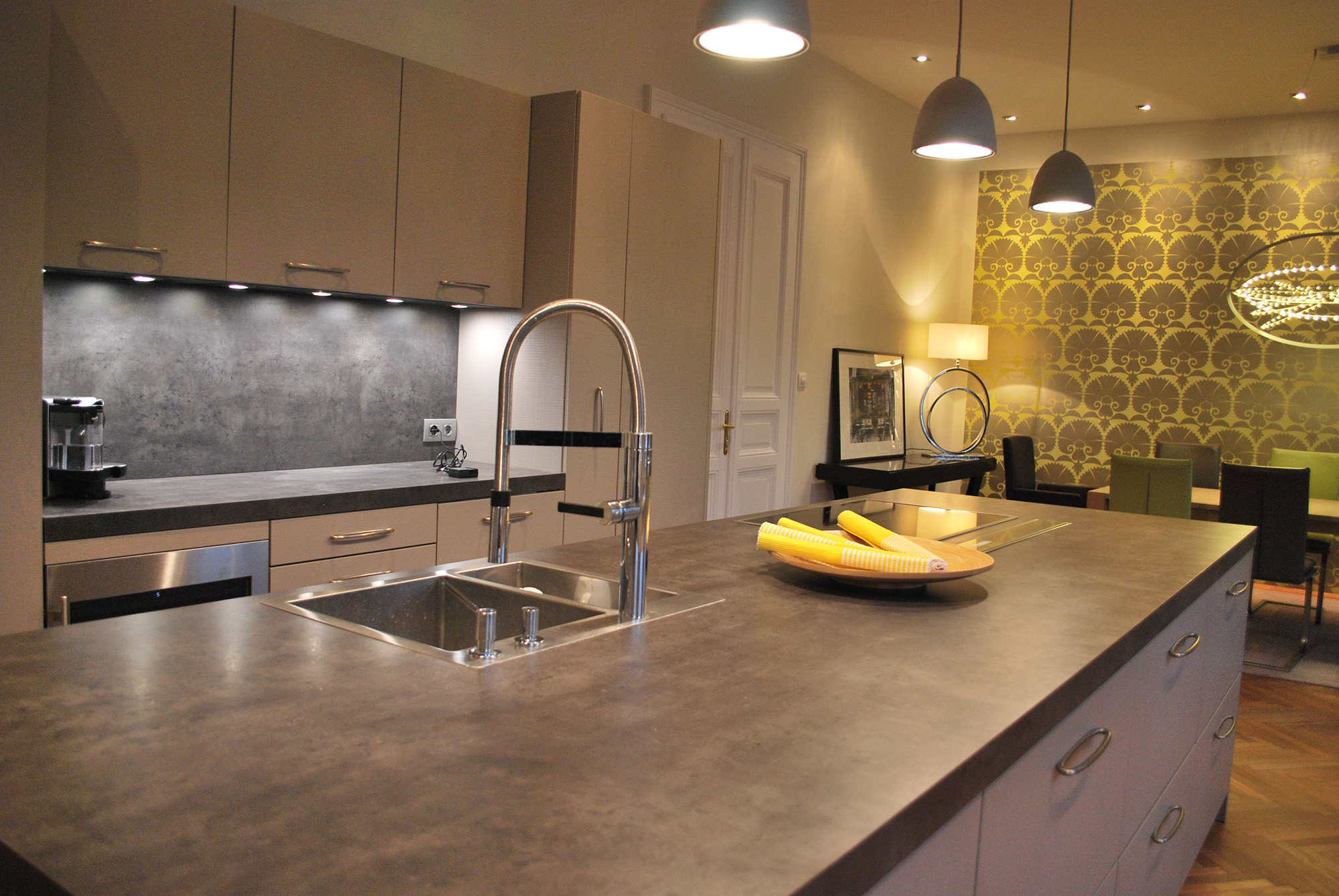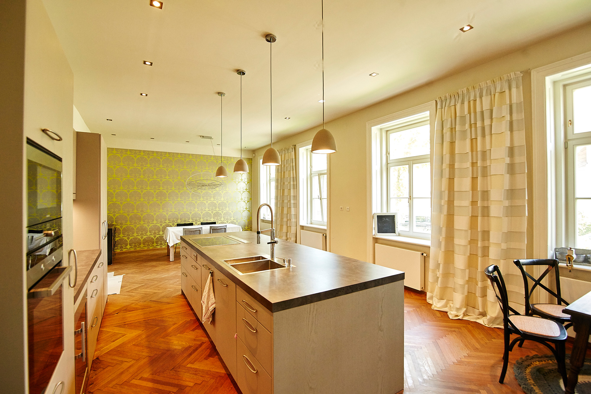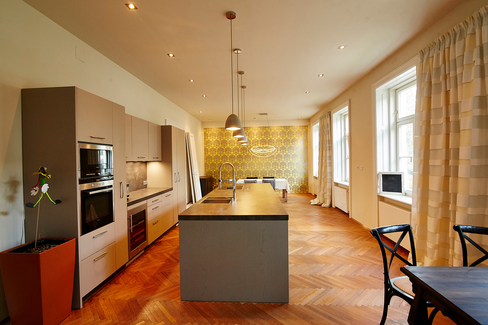 - Erdgeschoß: Wohnbereich mit offener Küche 81 m²